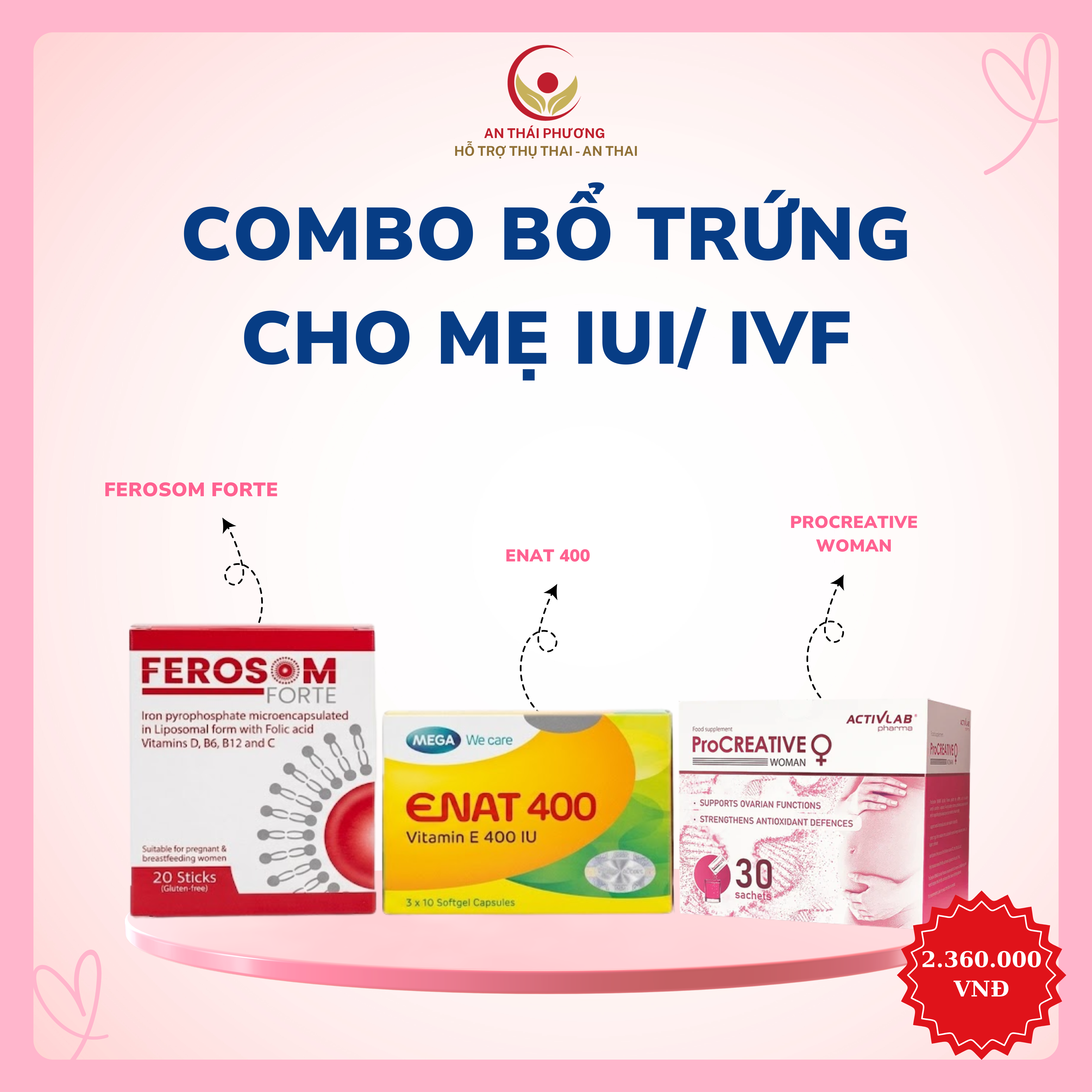Combo Bổ Trứng IUI/IVF là giải pháp dinh dưỡng chuyên sâu dành cho phụ nữ đang chuẩn bị mang thai hoặc điều trị hiếm muộn. Sự kết hợp giữa Ferosom Forte + Enat 400 + Procreative Woman giúp cải thiện chất lượng trứng, tăng nội tiết và nâng cao tỷ lệ đậu thai.
